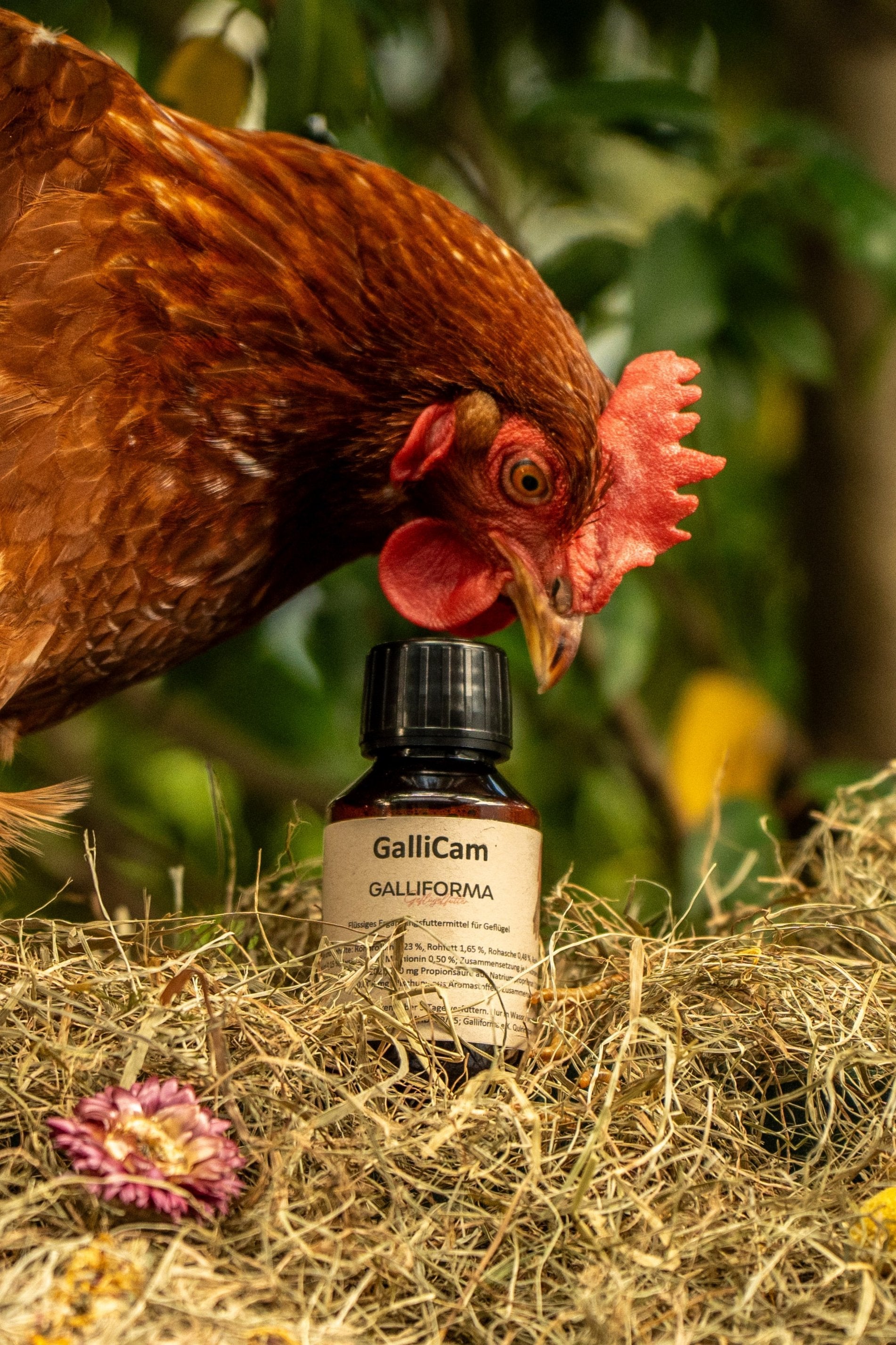 Ergänzungsfuttermittel für Geflügel; Analytische Bestandteile und Gehalte: Rohprotein 1,23 %, Rohfett 1,65 %, Rohasche 0,48 %, Rohfaser 0,00 %, Feuchte 53,00 %, Natrium 0,15 %, Lysin 0,80 %, Methionin 0,50 %; Zusammensetzung je L: Konservierungsmittel: 2.100 mg Sorbinsäure aus Kaliumsorbat (1k202), 780 mg Propionsäure aus Natriumproprionat (1k281), 2.000 mg Zitronensäure (1a330), Aromastoffe: 300.000 mg Mischung aus Aromastoffen; Zusammensetzung: 1,2 Propandiol, Natriumcitrat, Kaliumchlorid; Hersteller: DE NI 400036; Inverkehrbringer: Galliforma e.K., Quirinstrasse 7, 40545 Düsseldorf