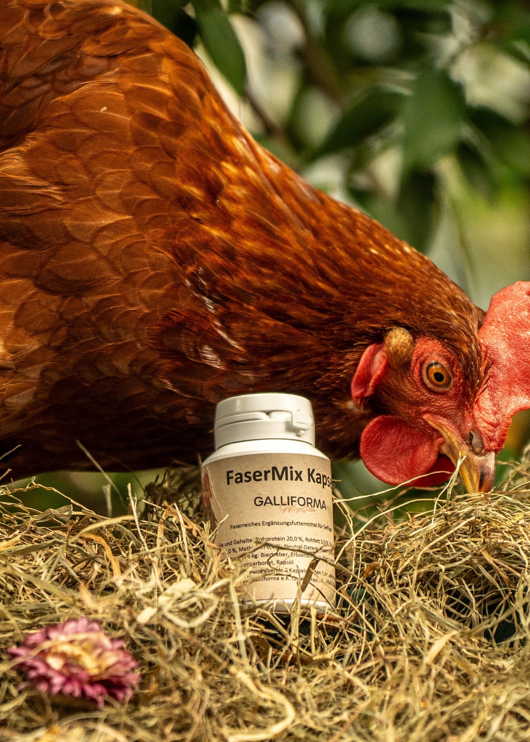 Ergänzungsfuttermittel für Geflügel; Analytische Bestandteile und Gehalte: Rohprotein 20,0 %, Rohfett 5,0 %, Rohasche 7,8 %, Rohfaser 17,8 %, Stärke 4,3 %, Natrium 0,14 %, Lysin 1,0 %, Methionin 0,4 %, Neutral-Deterg.-Faser (aND-Fom) 47,6 %, Saure Deterg.-Faser (AD-Fom) 23,9 %; Zusammensetzung pro kg: Biertreber, Erbsenschalen, Karottentrester, Bierhefe, Hefezellwandprodukt (Glucan-Mannan-Komplex), Calciumcarbonat, Rapsöl; Hersteller: DE SH 100022; Inverkehrbringer Galliforma e.K. Quirinstrasse 7 40545 Düsseldorf